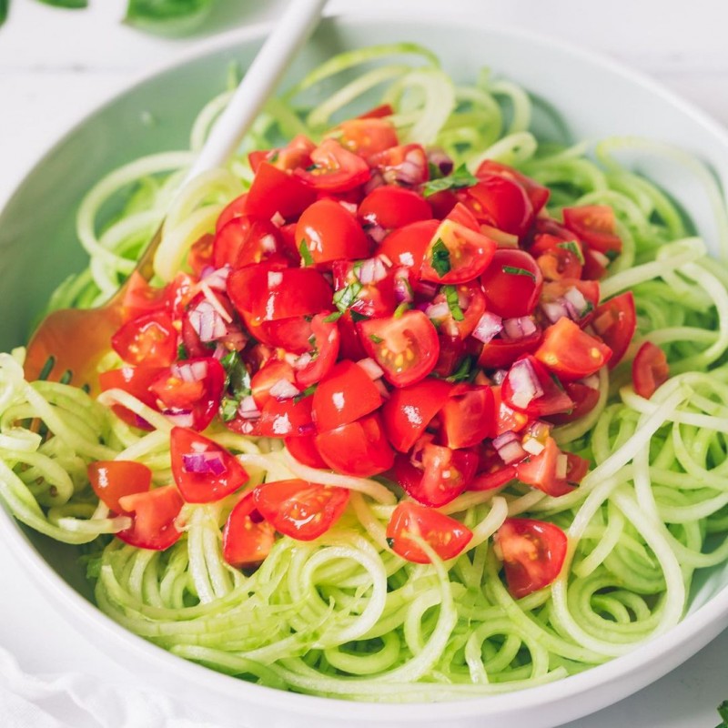 Pomoću ljuštilice za povrće napravite „rezance“ od krastavaca. Stavite u posudu i ostavite sa strane. Paradajz, beli luk, bosiljak, crveni luk, limunov sok i sirovi med dobro izmešajte u činiji. Pažljivo sipajte preko krastavaca i poslužite.