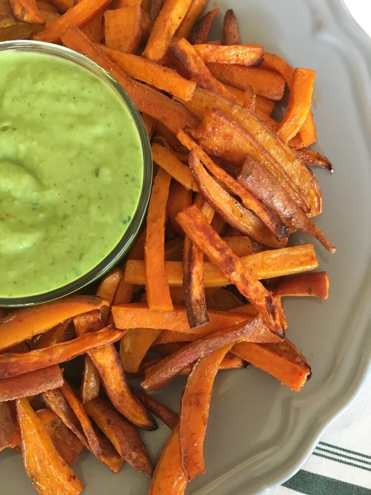 Za to vreme u blender ubacite 3 čena belog luka, oljušteni avokado, dodajte sok od limuna, so i biber i izblendirajte dok ne dobijete glatku masu. Poslužite je u staklenoj manjoj činiji, a uokolo stavite „pomfrit“ od slatkog krompira.