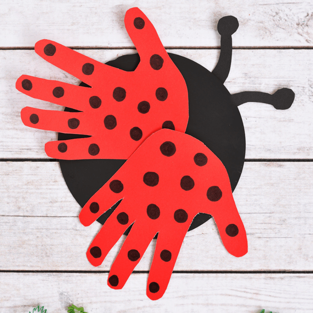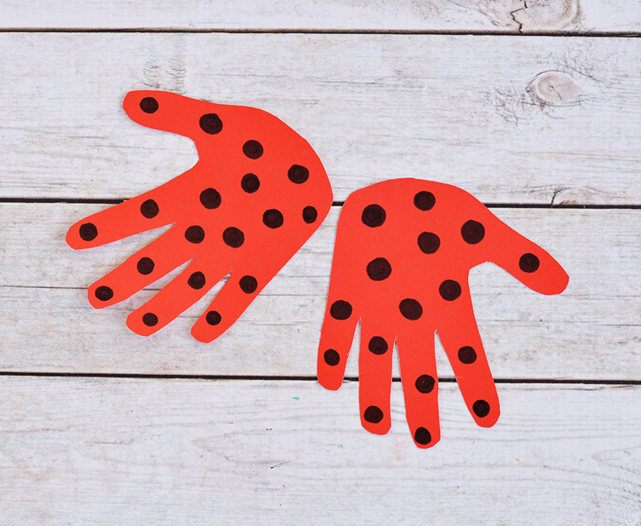Na crveni papir postavite i opcrtajte detetove ruke i zatim ih isecite. Ovo će biti krila vaše bubamare, pa dajte detetu crni marker da iscrta tufne na krilima.