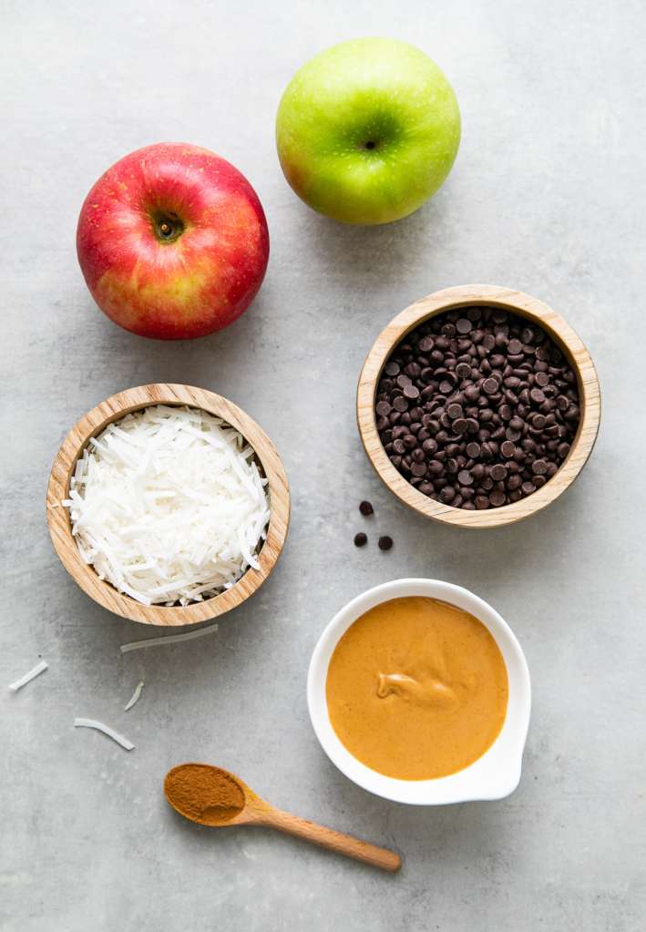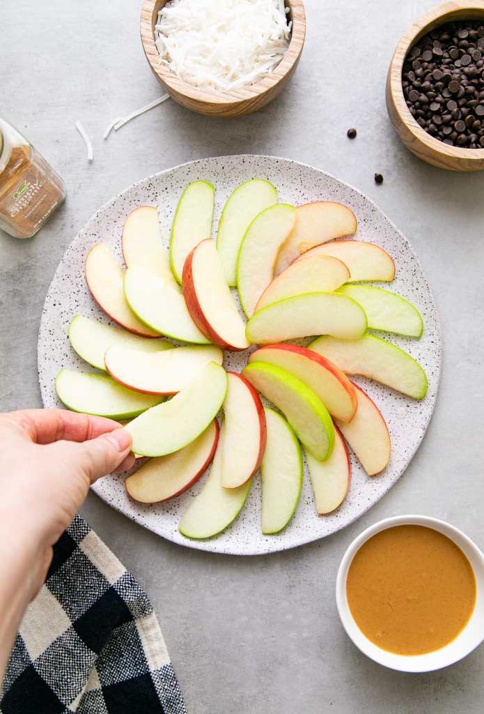 Isecite jabuke u tanke kriške i napravite na tanjiru lepezu od istih. Pospite sve jabuke cimetom, zatim narendanim kokosom, čokoladnim čipsom i prelijte kikiriki puterom koji ste prethodno malo ugrejali, kako biste ga lakše odvajali od kašičice.
