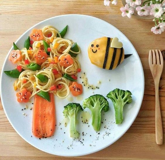 Isecite šargarepu modulom na cvetove, ako nemate biće dobri i kružići, a drugu šargarepu rasecite po dužini i servirajte na tanjiru kao na slici da izgleda kao drvo i oblikujte krošnju od špageta i šargarepe u obliku cvetova. Ukrasite tanjir svim sastojcima i cvetovima brokolija naslikajte žbunje.