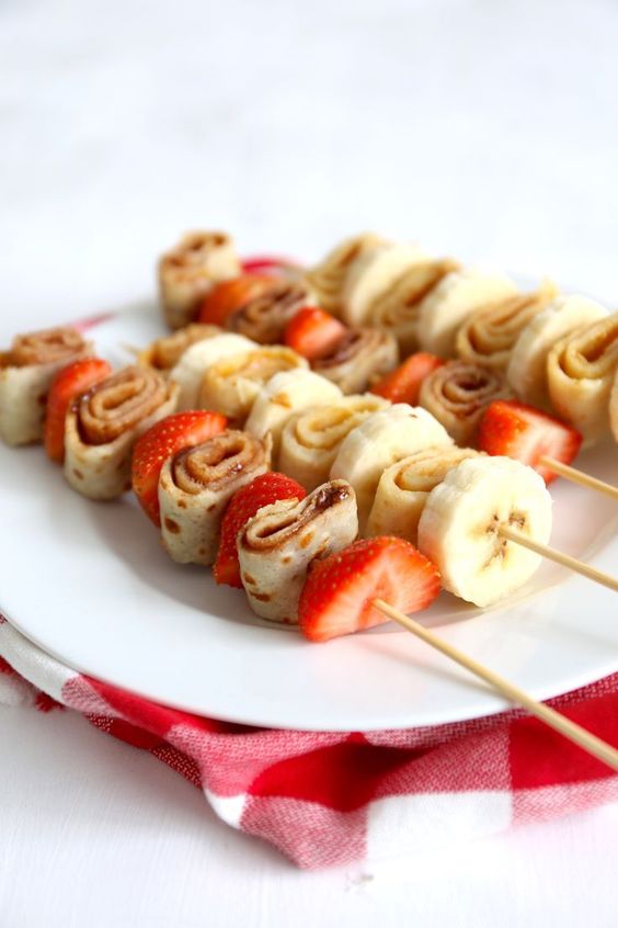 Isecite palačinke na male parčiće kao na slici i ređajte naizmenično. Videćete kako su ukusni i zdravi ovi ražnjići. Deca ih vole, a pored palačinki pojedu i voće.