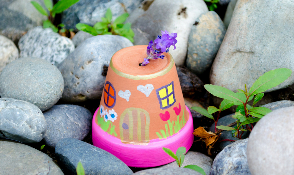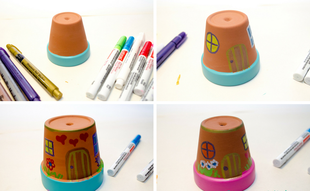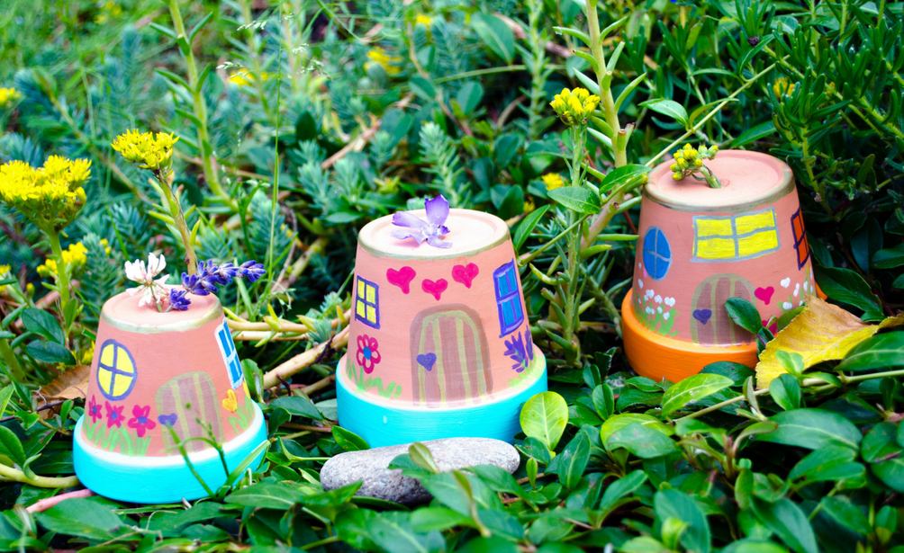 Potrebno je par malih glinenih saksija, koje ćete okrenuti naopačke i oslikati kao male kućice za vile koje sigurno često posećuju vaše cveće, zbog čega vam tako lepo napreduje.