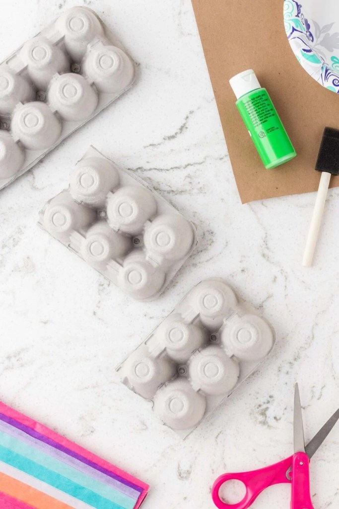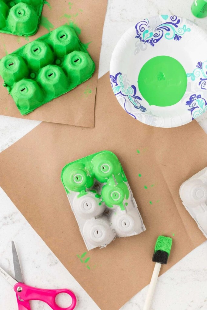 Nakon toga uzimte kartone od jaja, isecite ih na željenu veličinu, obojite u zelenu boju i takođe ostavite sa strane da se osuše. Lako ćete obojiti kartone sa sunđerom i bojama po vašem odabiru ili one koje imate kod kuće ( vodene boje, tempere ili akrilne boje)