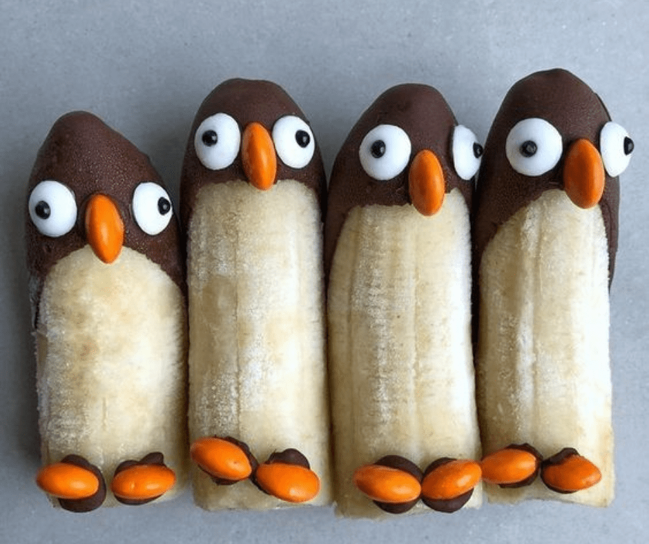 Kroz različite sličice prikazujemo vam kako banane možete obući u lava, pingvina, žirafu ili puža. Topljena čokolada biće od pomoći prilikom kreacija, kao i različiti bomboni, mali, ali i žele. Banane izgleda vole da poziraju i da se „modiraju“.