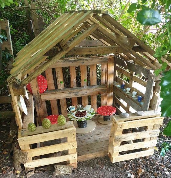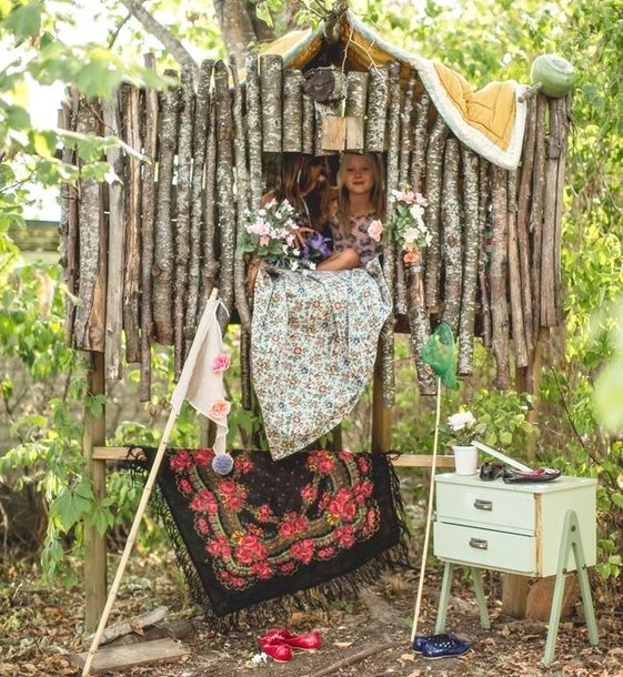 Nakon kućice na travi, možete napraviti ili improvizovati kućicu na blagom uzvišenju ili na drvetu. Od materijala koristite ono što vam je pri ruci. To mogu biti drvene palete, ali i grane i grančice. Ako vam takvi materijali ne odgovaraju odlučite se za mekane i šarene tkanine, pa improvizujte šatore-kućice.